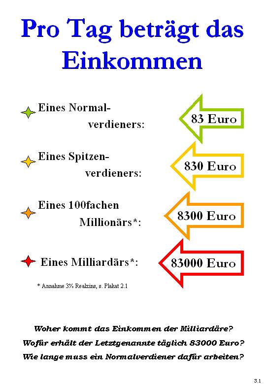 Nicht nur Arbeit, auch Besitz erbringt laufende Einkommen. Dieser Tatbestand ist an sich bereits fragwürdig, da nur der Leistende Lohn erhalten sollte. Noch ungerechter aber ist der Tatbestand, dass Besitz viel höhere Einkommen erbringen kann als die höchstbezahlte Arbeit. Während bei den Arbeitleistenden die höchsten Einkommen vielleicht beim Zehn- bis Zwanzigfachen eines Normalverdieners liegen, steigen die Besitzeinkommen auf das 100- und 1000fache an. In Einzelfällen liegen sie sogar noch höher. Noch problematischer als die Höhe dieser Einkommen ist jedoch der Tatbestand, dass sie den Beziehern ohne Gegenleistung zufließen. Das aber ist nur möglich, wenn die Einkommen der Arbeitleistenden entsprechend gekürzt werden. Denn in der Wirtschaft ist 2 x 2 immer 4 und nichts fällt vom Himmel. Das aber heißt, dass die Arbeitenden im gleichen Umfang ärmer werden wie die Besitzenden ohne Arbeit reicher. 3.1 |