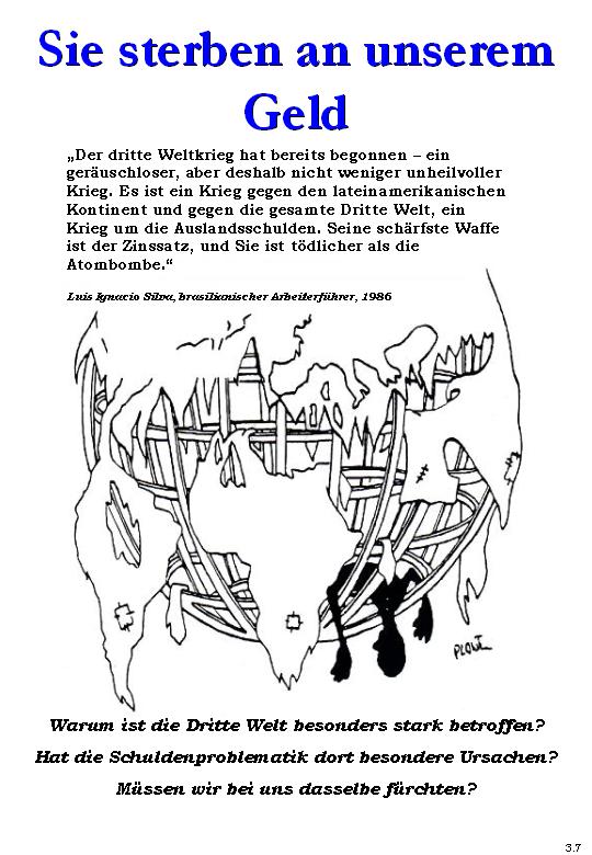 Wenn man bedenkt, dass die Zinszahlungen aus der Dritten Welt mindestens doppelt so hoch sind wie alle unsere rückzahlungsfreien Hilfeleistungen, wird die zunehmende Diskrepanz zwischen Nord und Süd verständlich. Hinzu kommt noch, dass alle Schuldner zwangsläufig versuchen, ihre Lasten durch einen höheren Absatz von Leistungen erträglicher zu machen. Da sie dabei in Konkurrenz zu anderen Anbietern stehen, unterbieten sie sich gegenseitig. Das führt zu sinkenden Rohstoffpreisen, was nochmals die bereits überreichen Industrienationen bevorteilt. Dass bei alledem die Hungernden keine Rücksicht auf die Umwelt nehmen und notfalls den letzten Baum fällen, darf man ihnen nicht zum Vorwurf machen. Sicherlich werden die reichen Länder aufgrund dieser Mechanismen noch eine Weile reicher werden und die bereits armen Länder noch ärmer. Am Ende aber werden auch wir die Zeche für die Folgen dieser ungerechten Verhältnisse mitbezahlen müssen. 3.7 |