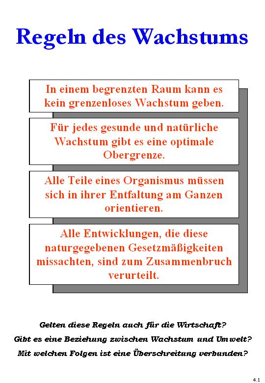 Auf der Erde ist alles Geschehen natürlichen Gesetzmäßigkeiten unterworfen. Das gilt auch für das Wirtschaften und damit für die gesamte Volkswirtschaft. Ein dauerndes Wachstum ist darum im wirtschaftlichen Bereich ebenso wenig möglich wie in der Natur. Denn auch für alle wirtschaftsbezogenen Entwicklungsprozesse gibt es optimale Grenzen, deren Überschreiten mit zunehmenden Problemen gekoppelt ist. Diese optimalen Grenzen ergeben sich einmal aus der notwendigen Rücksicht auf die Gesunderhaltung der Natur, zum anderen aus der nachlassenden Arbeits- und Verbrauchsbereitschaft, die immer mit natürlichen Sättigungsprozessen verbunden ist. Wichtig für die Stabilität eines Organismus ist es weiter, dass alle seine Teile im Gleichschritt miteinander wachsen. Auch das gilt für die Wirtschaft, in der ein Überwachstum einzelner Bereiche oder Ansprüche, z.B. die des Kapitals, schließlich zu Krisen und Zusammenbrüchen führen muss. 4.1 |